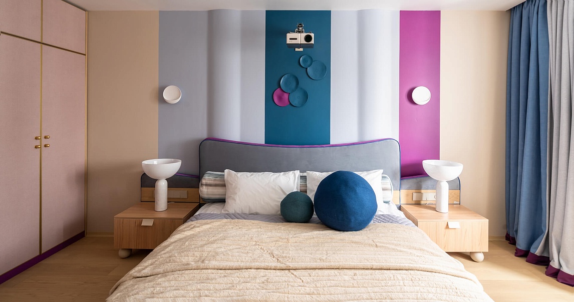 Детали интерьера бережно, но ненавязчиво напоминают о том,что герои любят спорт (через волнообразную, плавную геометрию интерьера – отсыл к волнам или элементы интерьера в виде подушек-шаров, круглых ножек прикроватных тумб или пуфика перед кроватью, напоминающих про футбол)